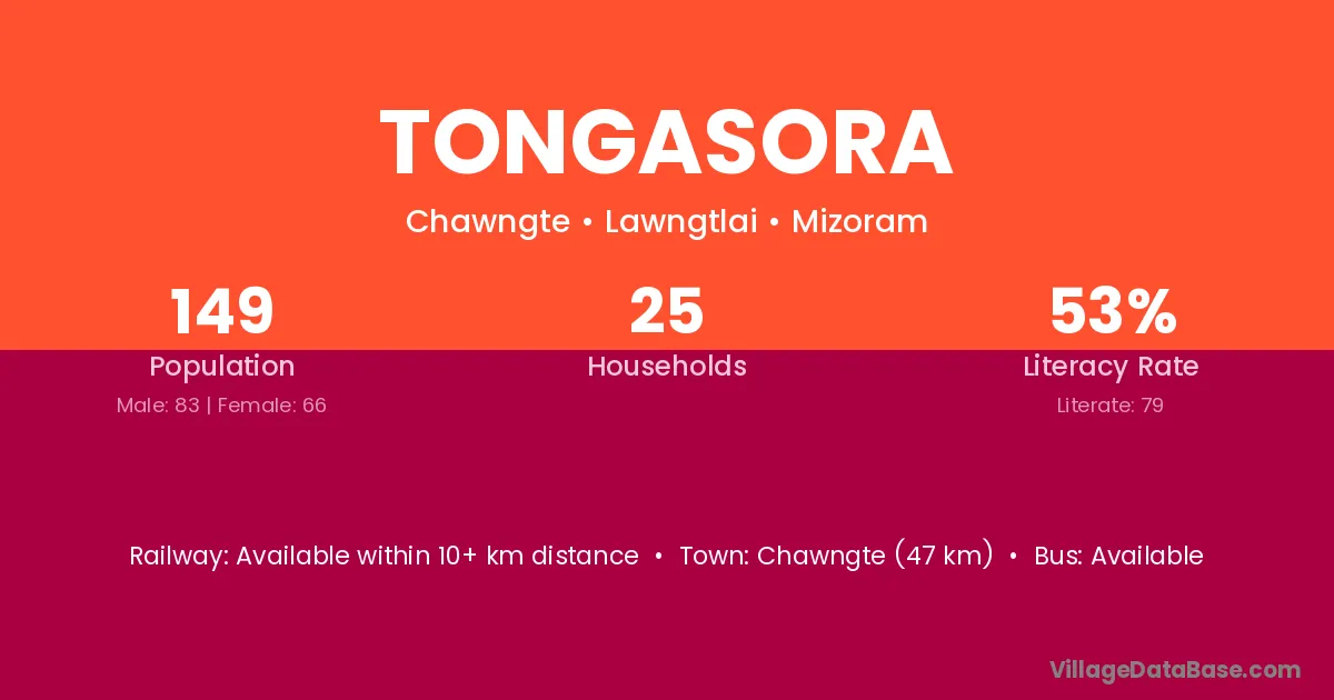 Chawngte (47 km) is the nearest town to Tongasora village for major economic activities and is located approximately 47 km away.