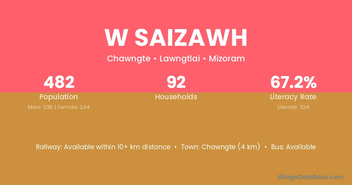 Chawngte (4 km) is the nearest town to W Saizawh village for major economic activities and is located approximately 4 km away.