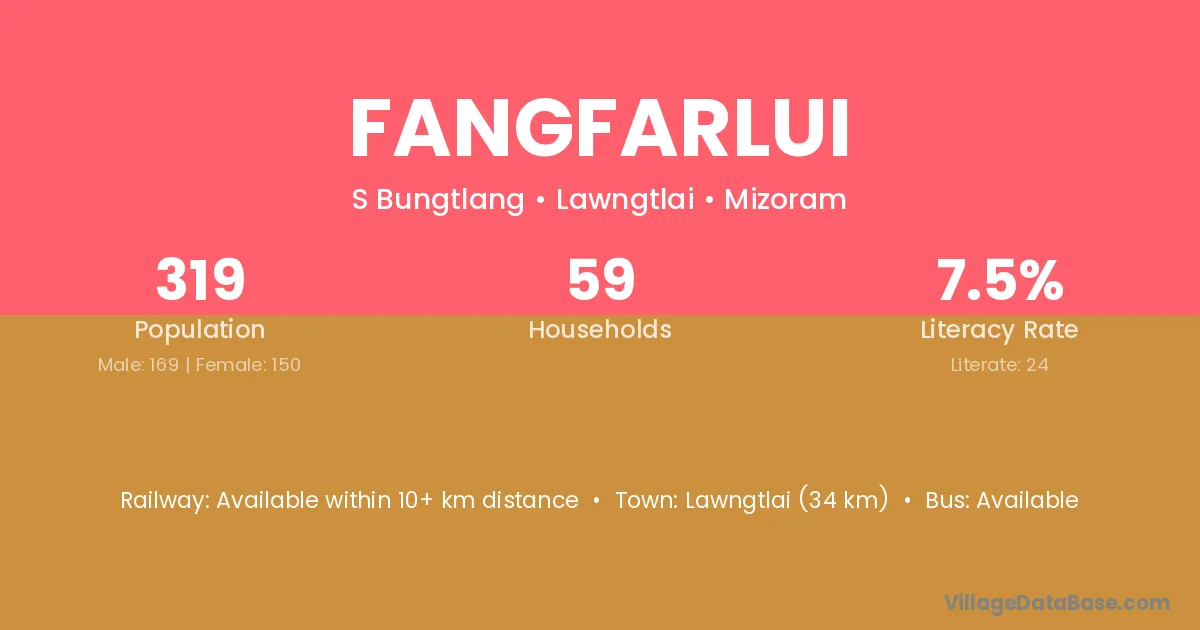 Lawngtlai (34 km) is the nearest town to Fangfarlui village for major economic activities and is located approximately 34 km away.