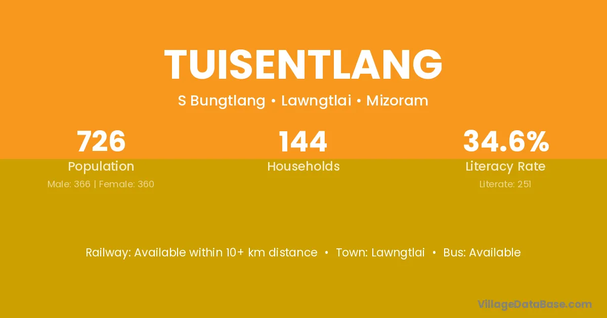 Tuisentlang village has a total population of 726 people, of which 366 are males and 360 are females.