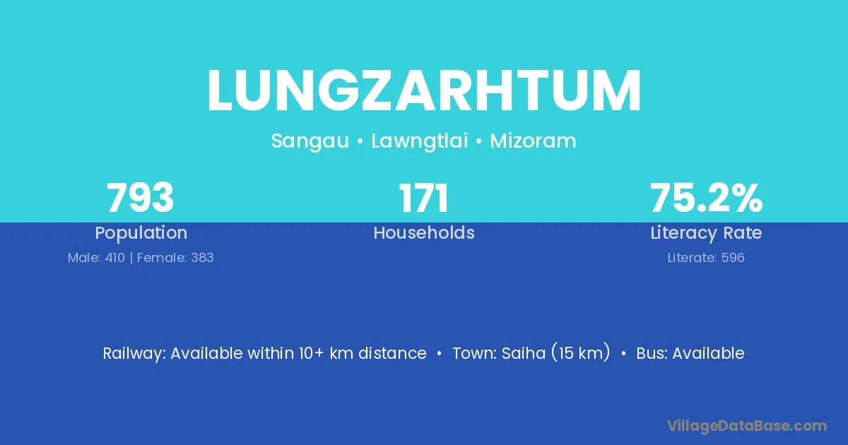 Saiha (15 km) is the nearest town to Lungzarhtum village for major economic activities and is located approximately 15 km away.