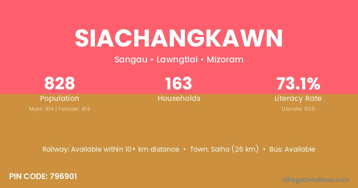Siachangkawn village has a total population of 828 people, of which 414 are males and 414 are females.