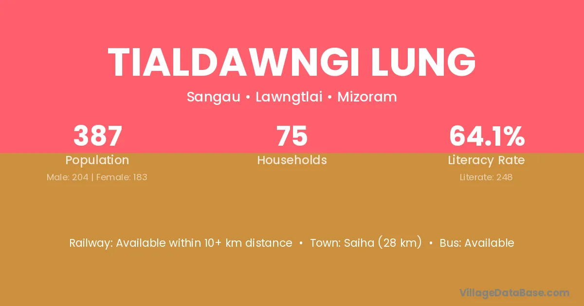 Tialdawngi Lung village has a total population of 387 people, of which 204 are males and 183 are females.