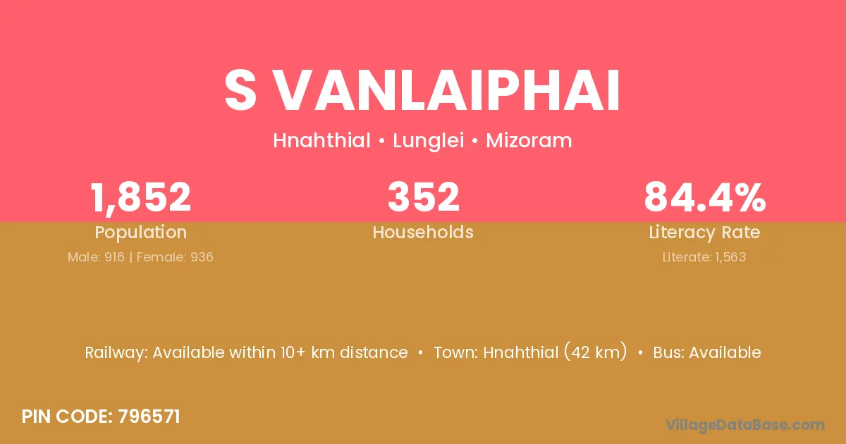 Hnahthial (42 km) is the nearest town to S Vanlaiphai village for major economic activities and is located approximately 42 km away.