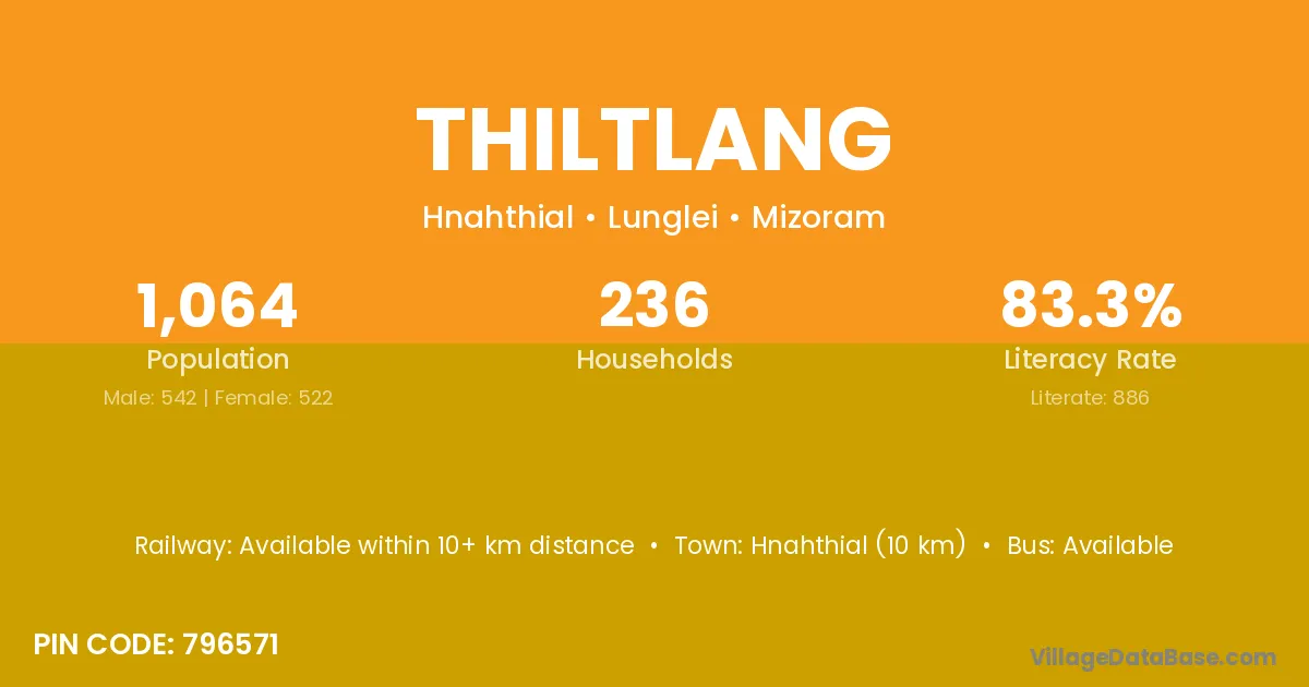 Hnahthial (10 km) is the nearest town to Thiltlang village for major economic activities and is located approximately 10 km away.