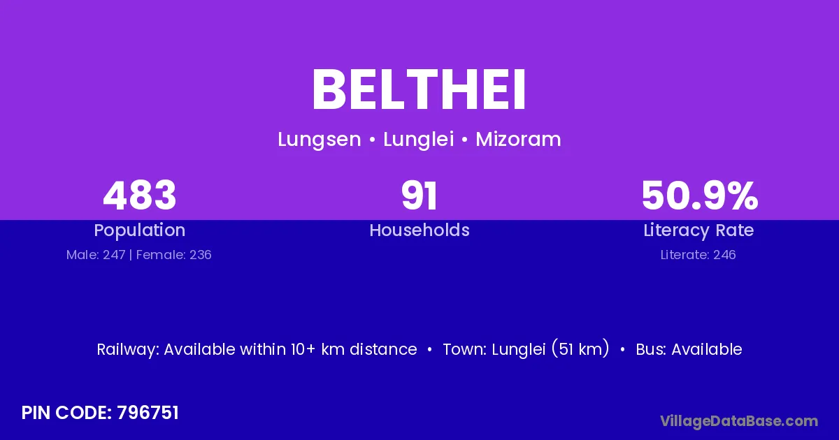 Lunglei (51 km) is the nearest town to Belthei village for major economic activities and is located approximately 51 km away.