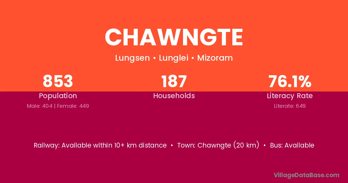 Chawngte village has a total population of 853 people, of which 404 are males and 449 are females.