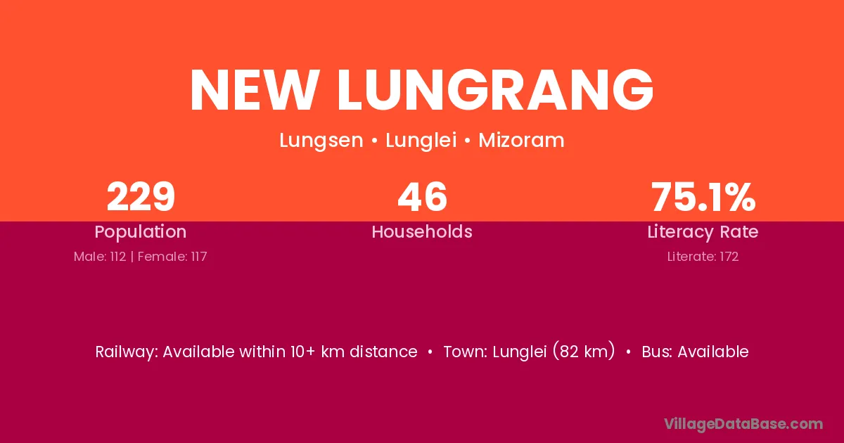 New Lungrang village has a total population of 229 people, of which 112 are males and 117 are females.