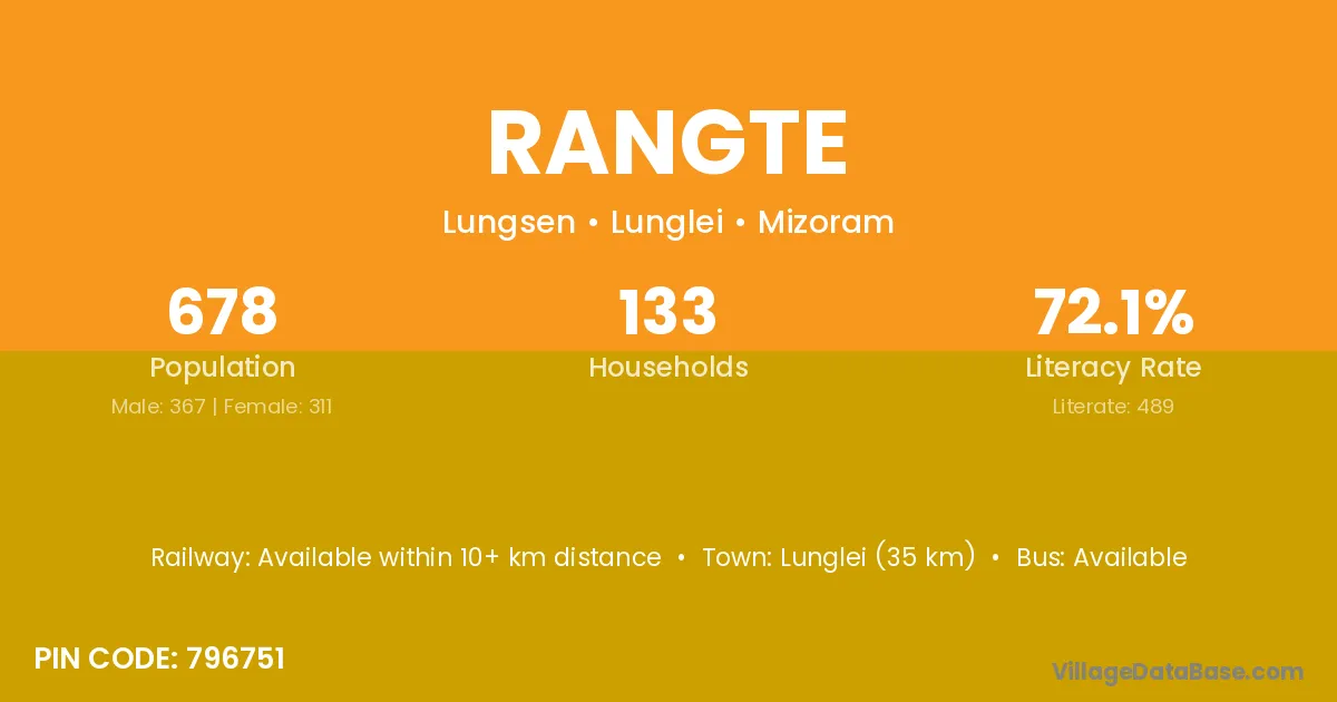 Lunglei (35 km) is the nearest town to Rangte village for major economic activities and is located approximately 35 km away.