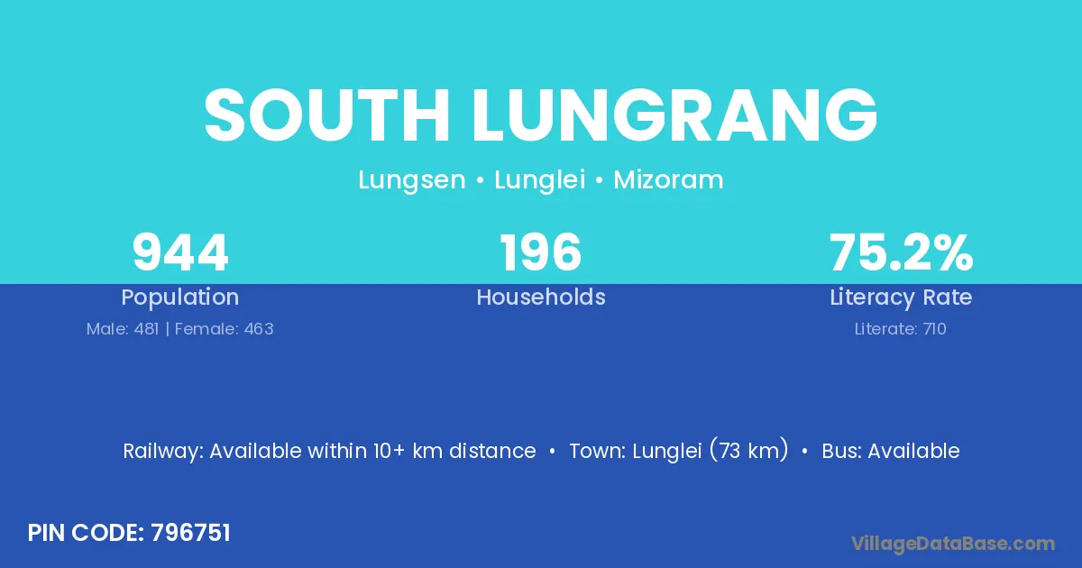 Lunglei (73 km) is the nearest town to South Lungrang village for major economic activities and is located approximately 73 km away.