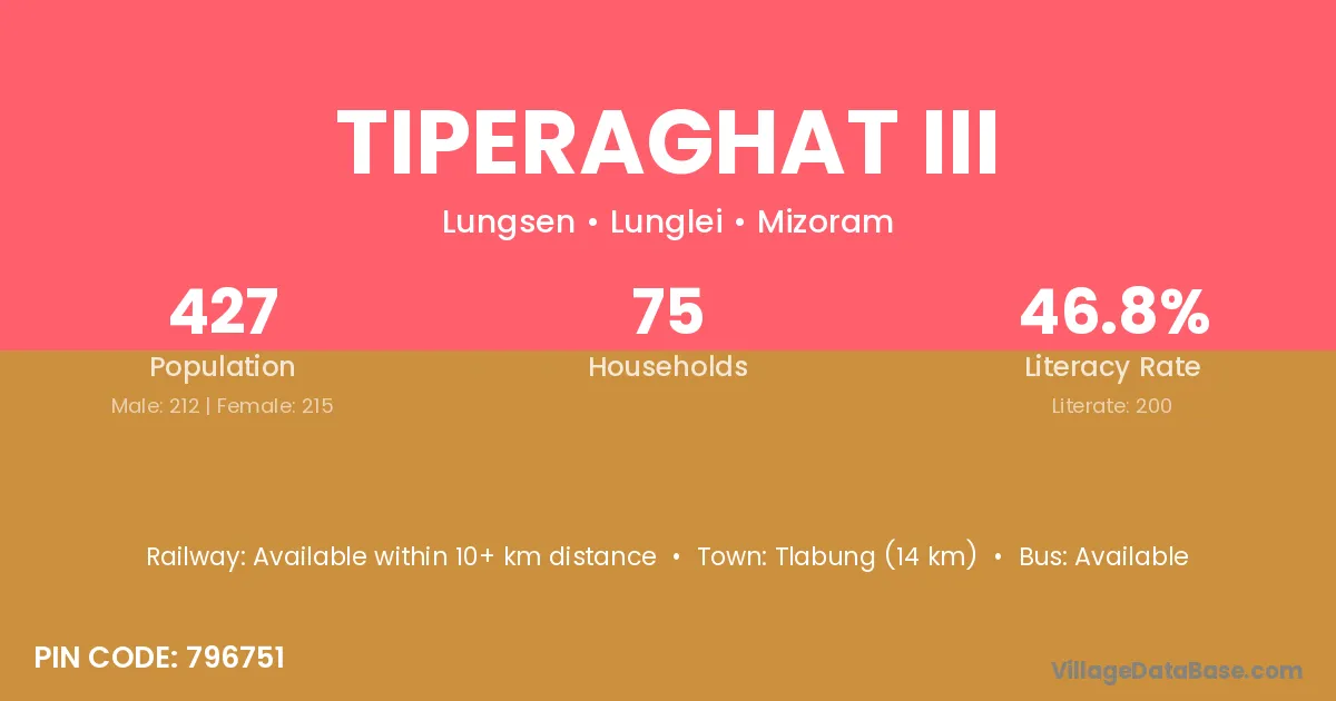 Tlabung (14 km) is the nearest town to Tiperaghat Iii village for major economic activities and is located approximately 14 km away.