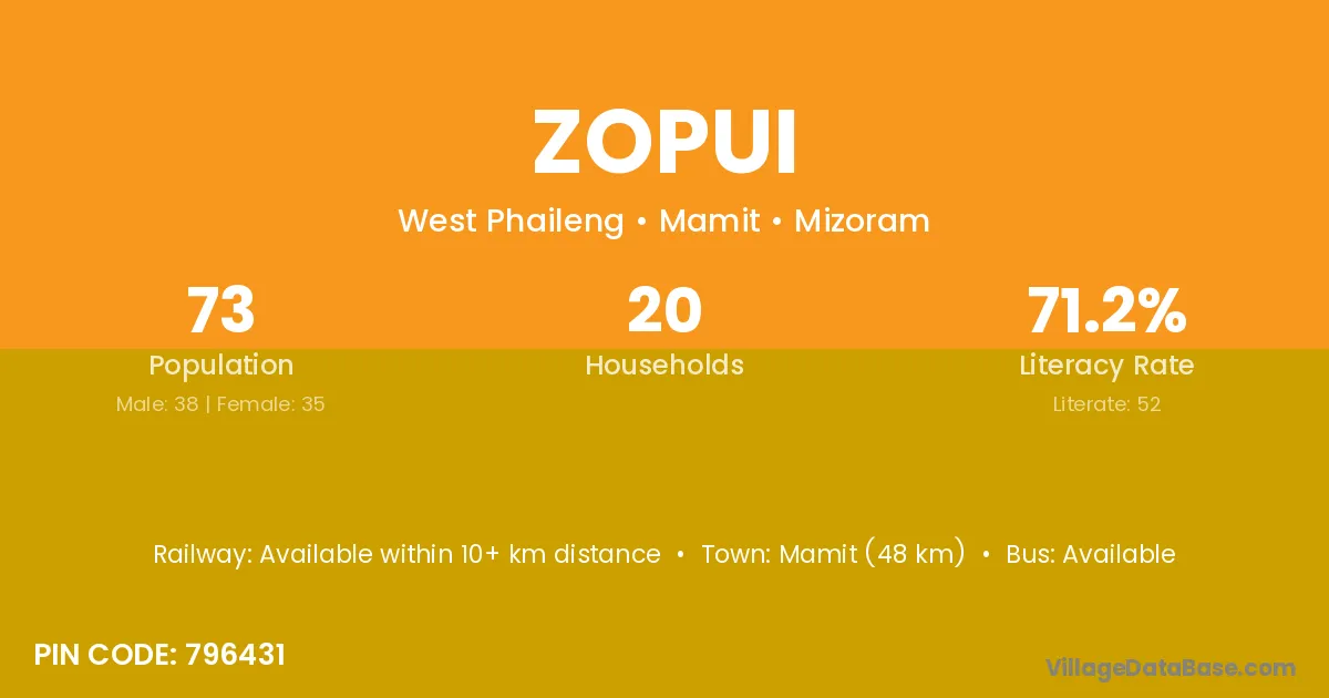 Mamit (48 km) is the nearest town to Zopui village for major economic activities and is located approximately 48 km away.