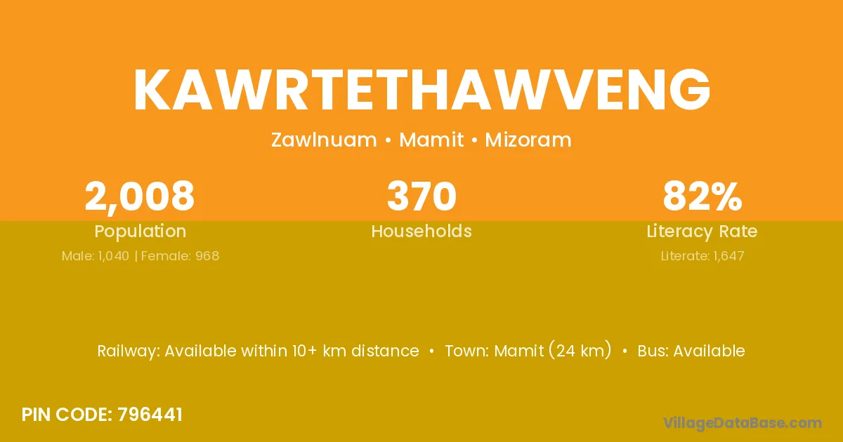 Mamit (24 km) is the nearest town to Kawrtethawveng village for major economic activities and is located approximately 24 km away.