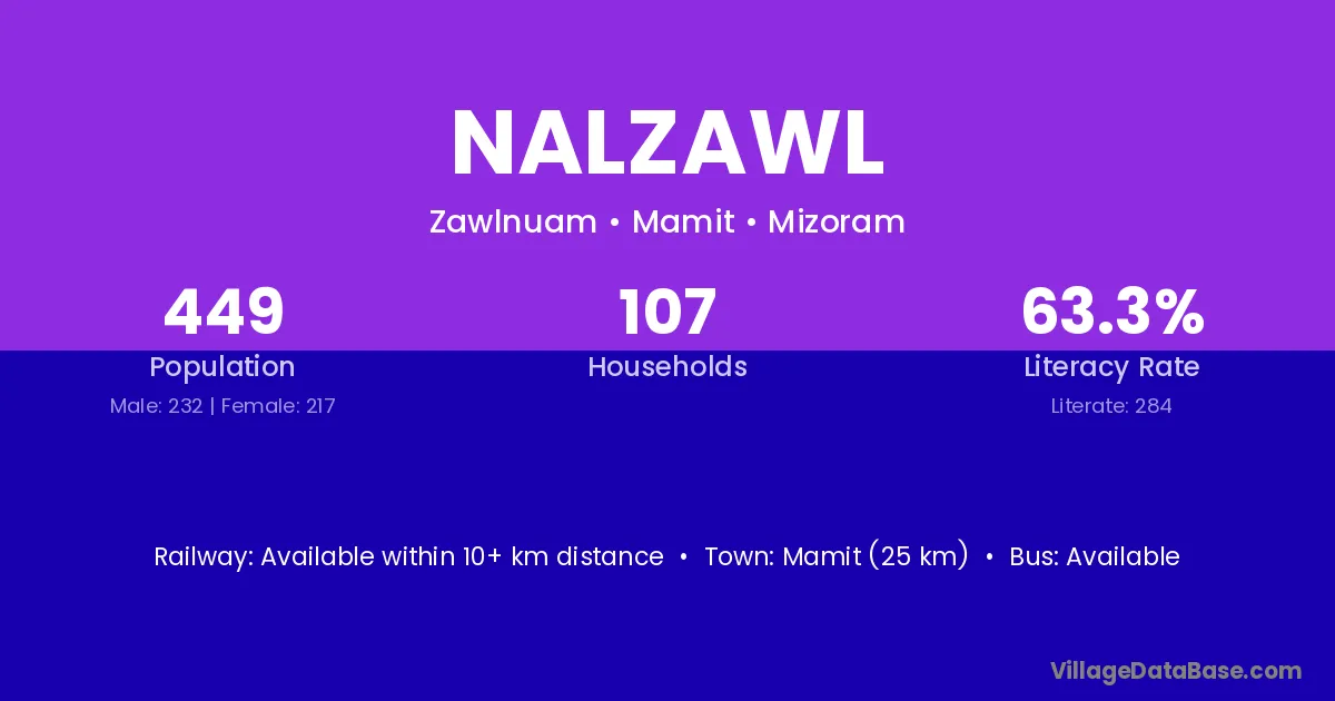 Mamit (25 km) is the nearest town to Nalzawl village for major economic activities and is located approximately 25 km away.