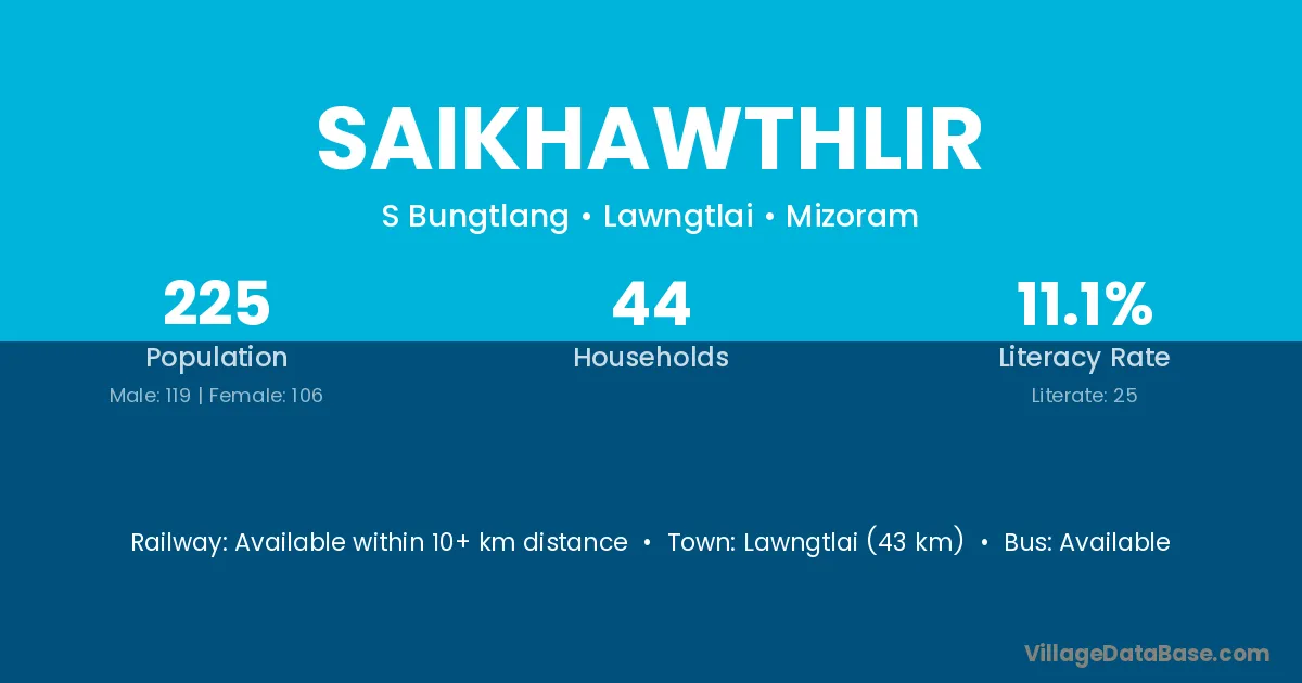 Zawlnuam (38 km) is the nearest town to Saikhawthlir village for major economic activities and is located approximately 38 km away.