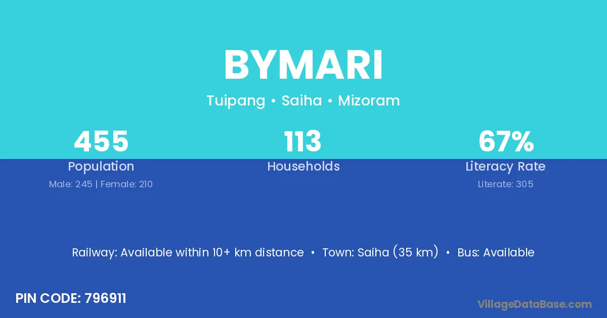 Saiha (35 km) is the nearest town to Bymari village for major economic activities and is located approximately 35 km away.