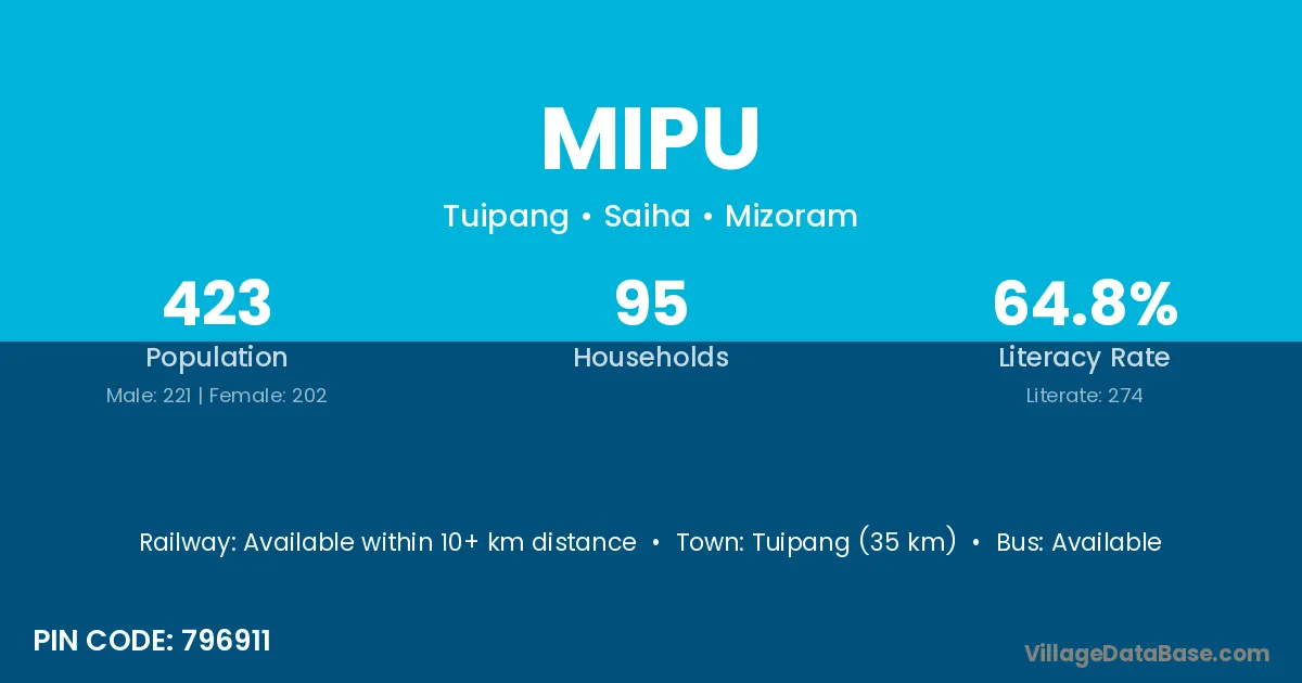 Mipu village has a total population of 423 people, of which 221 are males and 202 are females.
