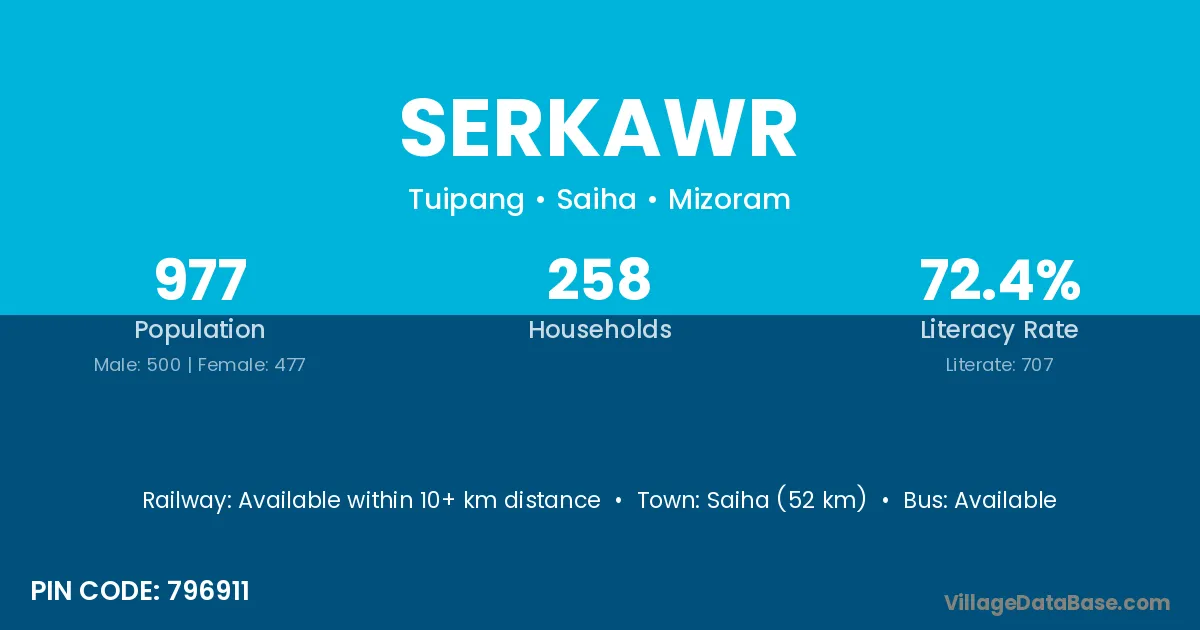 Saiha (52 km) is the nearest town to Serkawr village for major economic activities and is located approximately 52 km away.