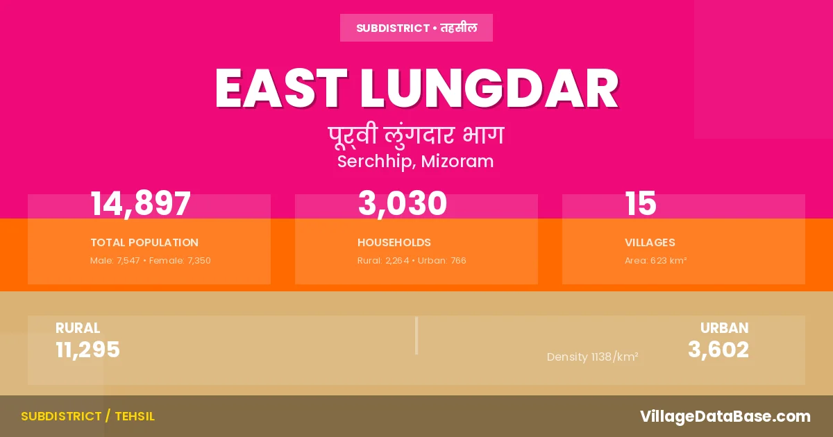 According to the 2011 census The total area of East Lungdar Subdivision is 623 km², with a population of 14897 people. The population density is N/A inhabitants per square kilometre, and there are approximately 3030 houses in the sub district.