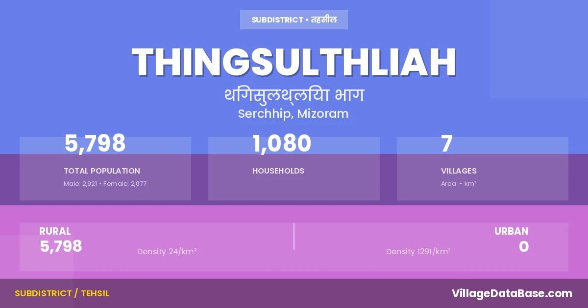 Thingsulthliah is a town and Subdivision in the Serchhip district of the Mizoram. In India, a Subdivision is a subdivision of a district responsible for the administration and revenue collection of a specific area within the district. Subdivisions play a crucial role in the local governance structure, contributing significantly to the development and administration of their communities.