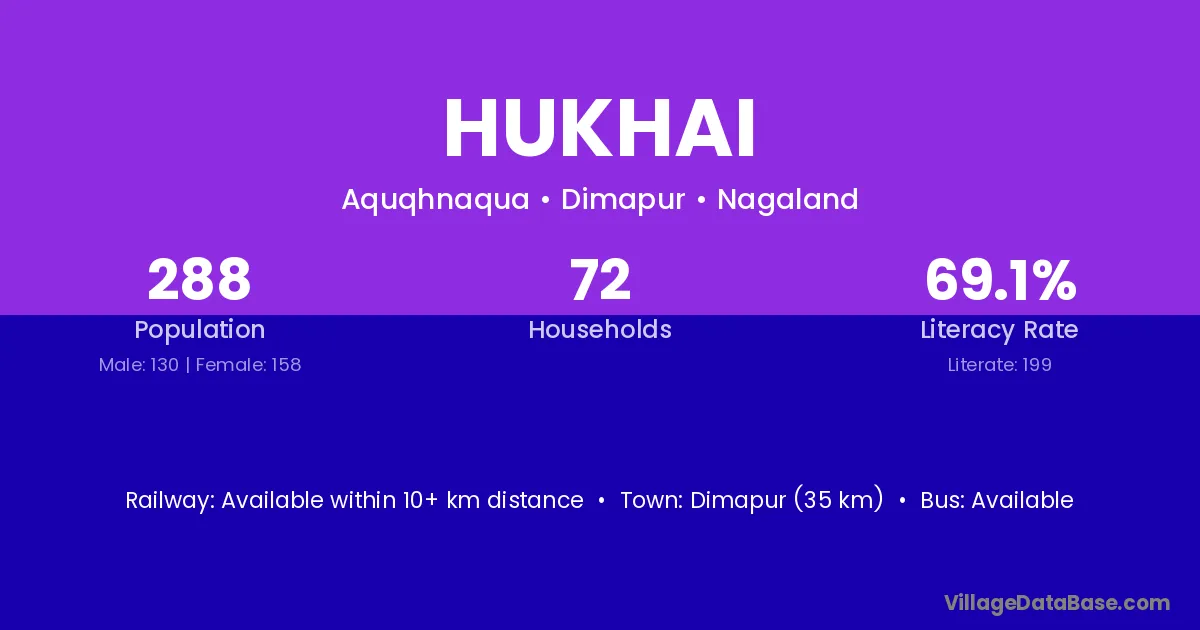 Dimapur (35 km) is the nearest town to Hukhai village for major economic activities and is located approximately 35 km away.