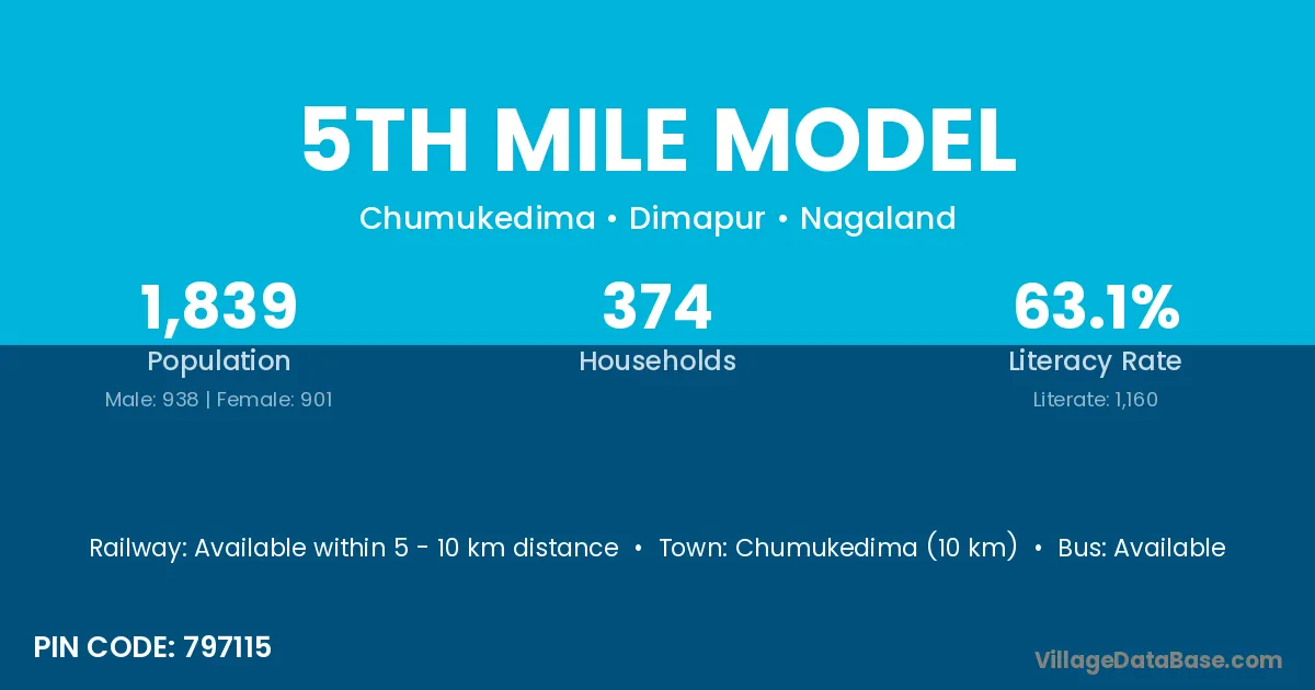 Chumukedima (10 km) is the nearest town to 5th Mile Model village for major economic activities and is located approximately 10 km away.
