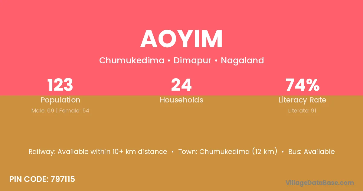 Chumukedima (12 km) is the nearest town to Aoyim village for major economic activities and is located approximately 12 km away.