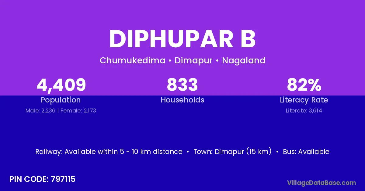 Dimapur (15 km) is the nearest town to Diphupar B village for major economic activities and is located approximately 15 km away.