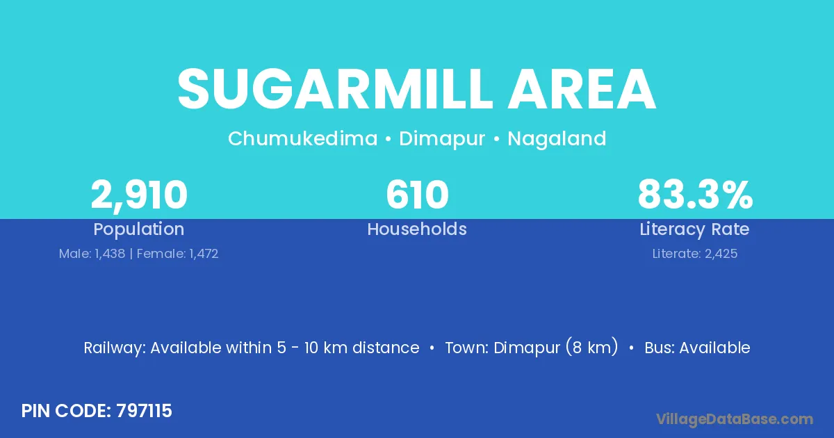Dimapur (8 km) is the nearest town to Sugarmill Area village for major economic activities and is located approximately 8 km away.