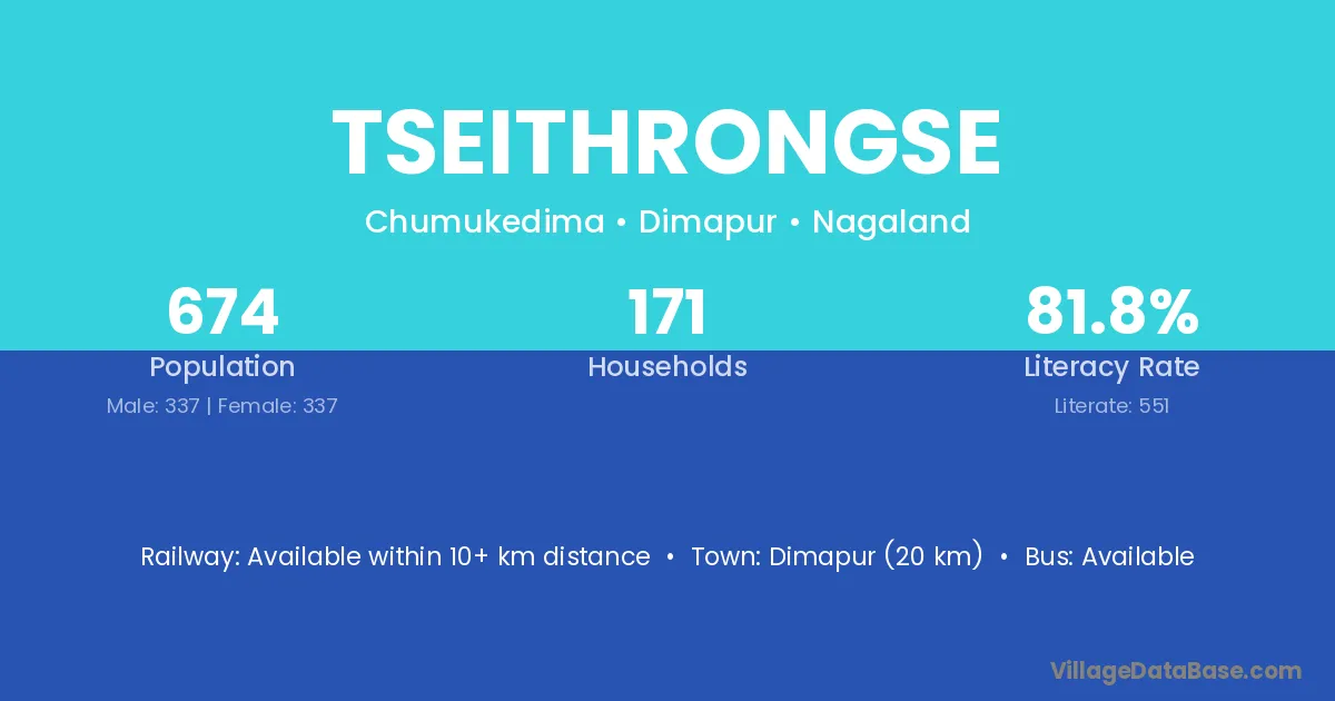 Tseithrongse village has a total population of 674 people, of which 337 are males and 337 are females.