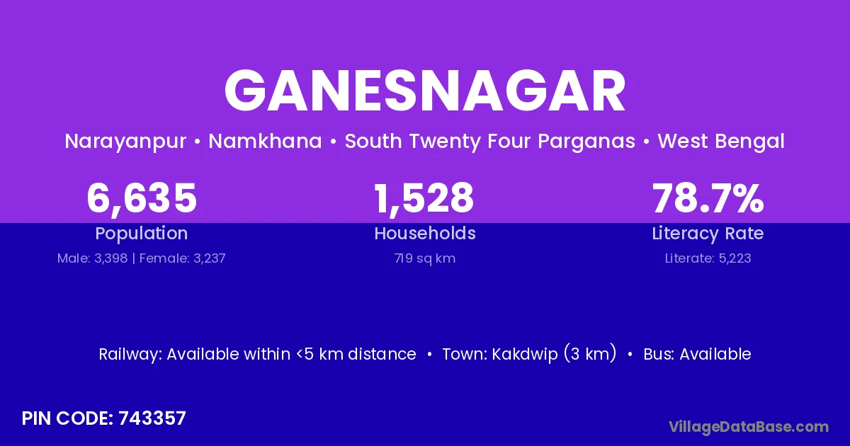 The literacy rate of Ganesnagar village is 60.59%. Male literacy stands at 62.81% and female literacy at 58.17%.