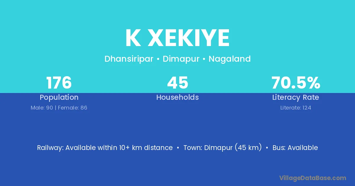 Dimapur (45 km) is the nearest town to K Xekiye village for major economic activities and is located approximately 45 km away.