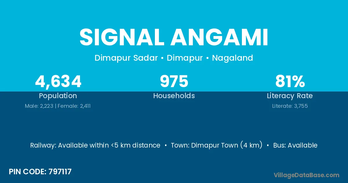 Signal Angami village has a total population of 4,634 people, of which 2,223 are males and 2,411 are females.