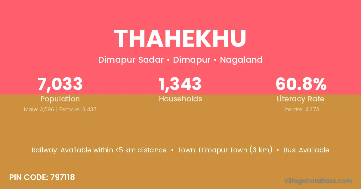 Dimapur Town (3 km) is the nearest town to Thahekhu village for major economic activities and is located approximately 3 km away.