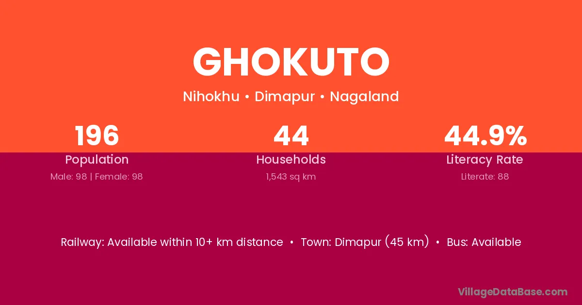 Ghokuto village has a total population of 196 people, of which 98 are males and 98 are females.