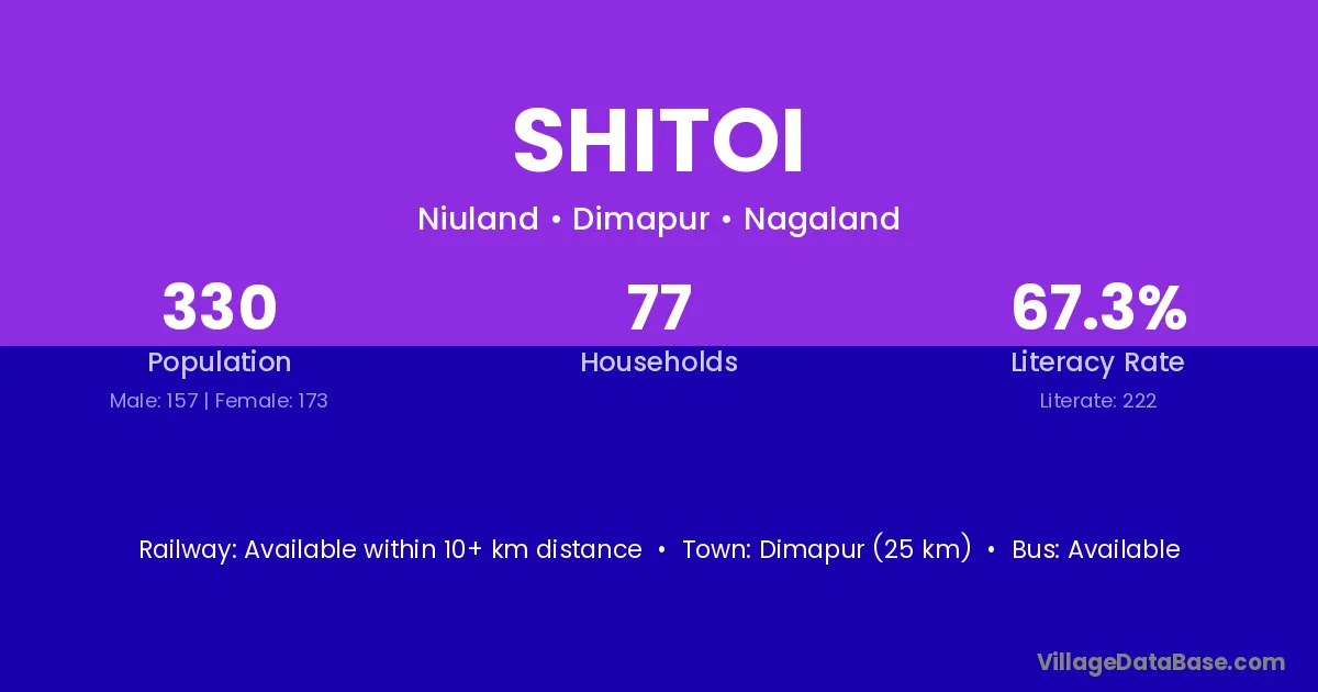 Dimapur (25 km) is the nearest town to Shitoi village for major economic activities and is located approximately 25 km away.