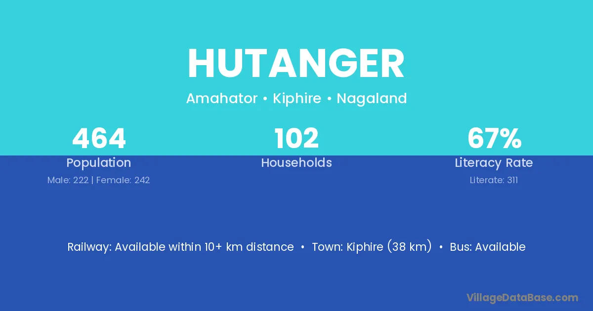 Kiphire (38 km) is the nearest town to Hutanger village for major economic activities and is located approximately 38 km away.