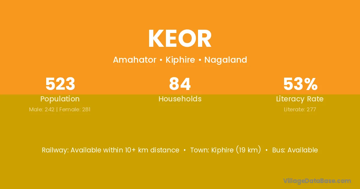 Kiphire (19 km) is the nearest town to Keor village for major economic activities and is located approximately 19 km away.