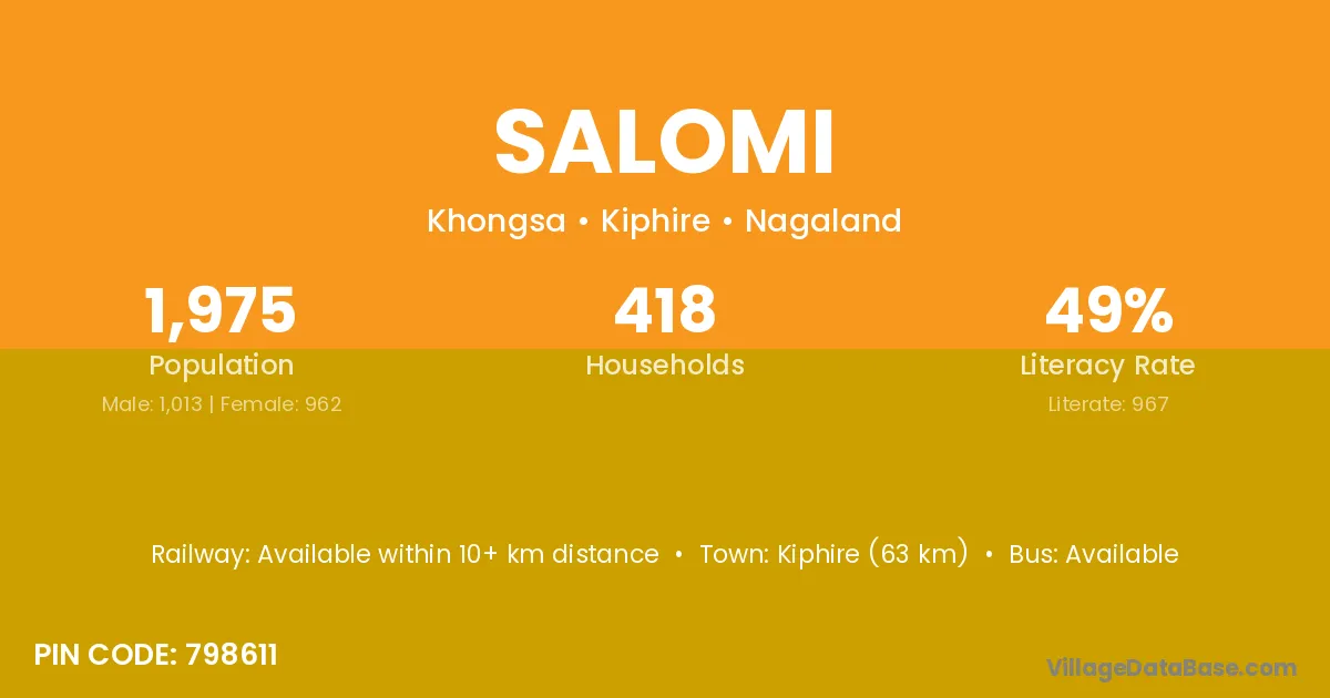 Kiphire (63 km) is the nearest town to Salomi village for major economic activities and is located approximately 63 km away.