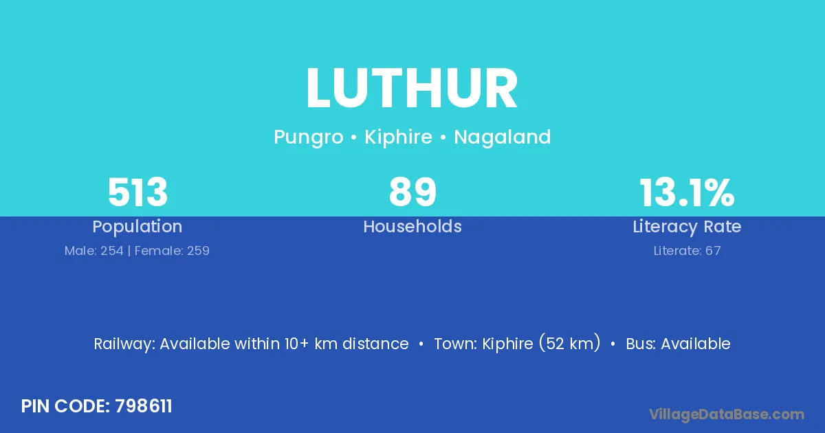 Kiphire (52 km) is the nearest town to Luthur village for major economic activities and is located approximately 52 km away.