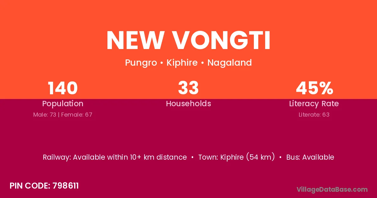 Kiphire (54 km) is the nearest town to New Vongti village for major economic activities and is located approximately 54 km away.