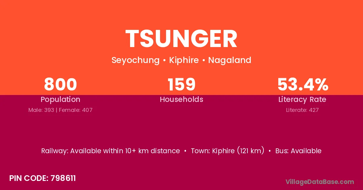 Kiphire (121 km) is the nearest town to Tsunger village for major economic activities and is located approximately 121 km away.