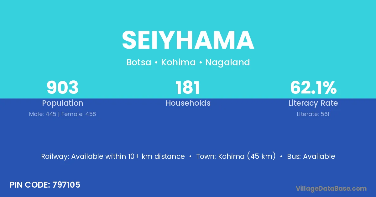 Kohima (45 km) is the nearest town to Seiyhama village for major economic activities and is located approximately 45 km away.