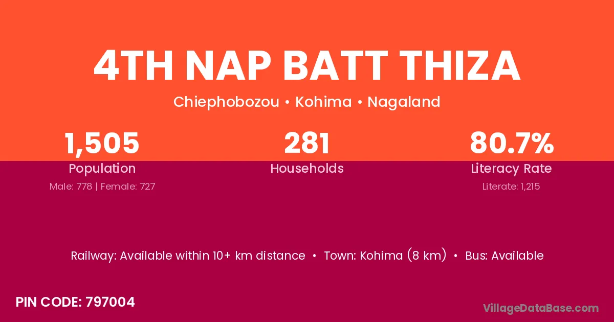 Kohima (8 km) is the nearest town to 4th Nap Batt Thiza village for major economic activities and is located approximately 8 km away.