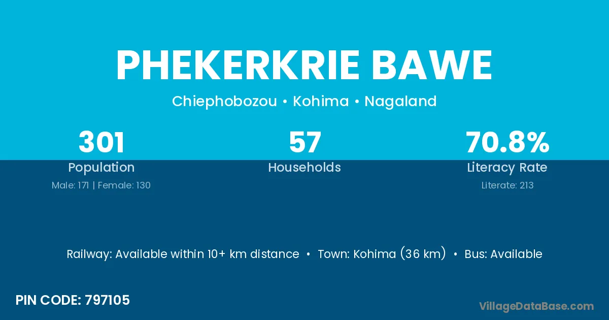 Kohima (36 km) is the nearest town to Phekerkrie Bawe village for major economic activities and is located approximately 36 km away.