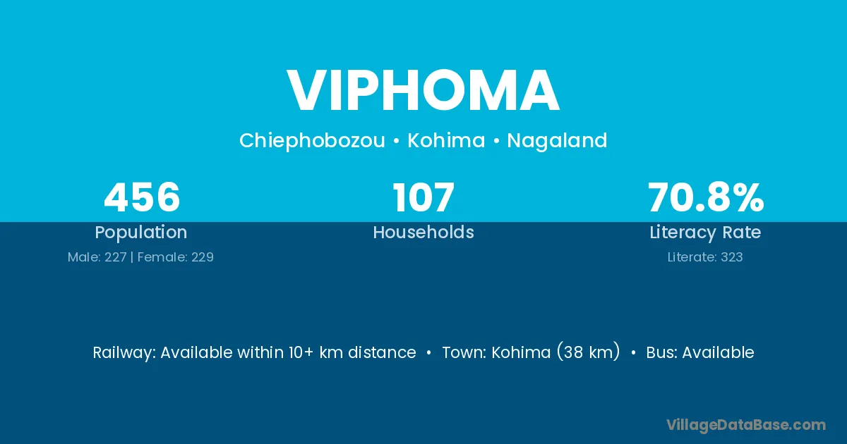 The literacy rate of Viphoma village is 70.83%. Male literacy stands at 70.48% and female literacy at 71.18%.