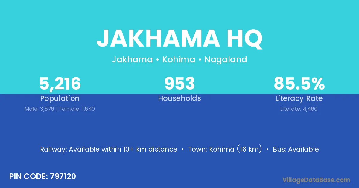 Kohima (16 km) is the nearest town to Jakhama Hq village for major economic activities and is located approximately 16 km away.
