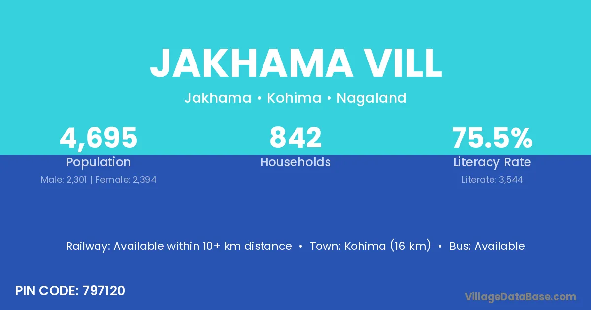Kohima (16 km) is the nearest town to Jakhama Vill village for major economic activities and is located approximately 16 km away.