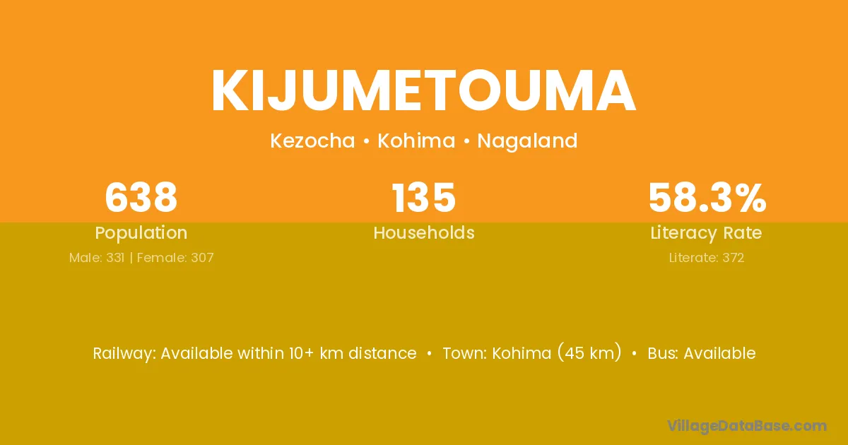 Kohima (45 km) is the nearest town to Kijumetouma village for major economic activities and is located approximately 45 km away.