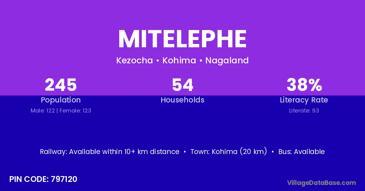 Kohima (20 km) is the nearest town to Mitelephe village for major economic activities and is located approximately 20 km away.